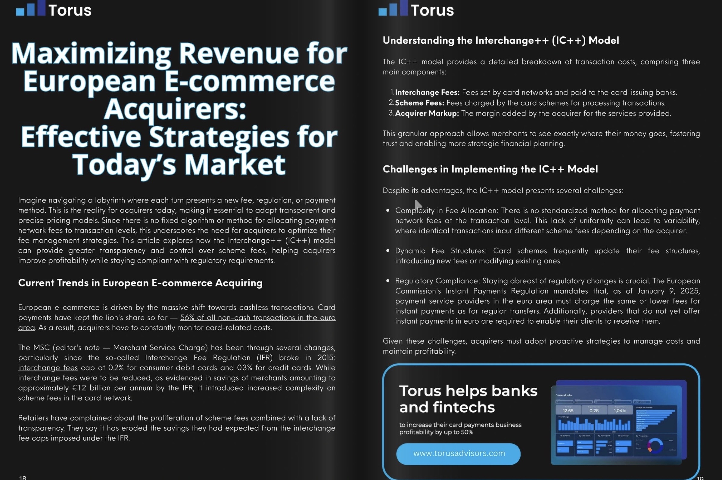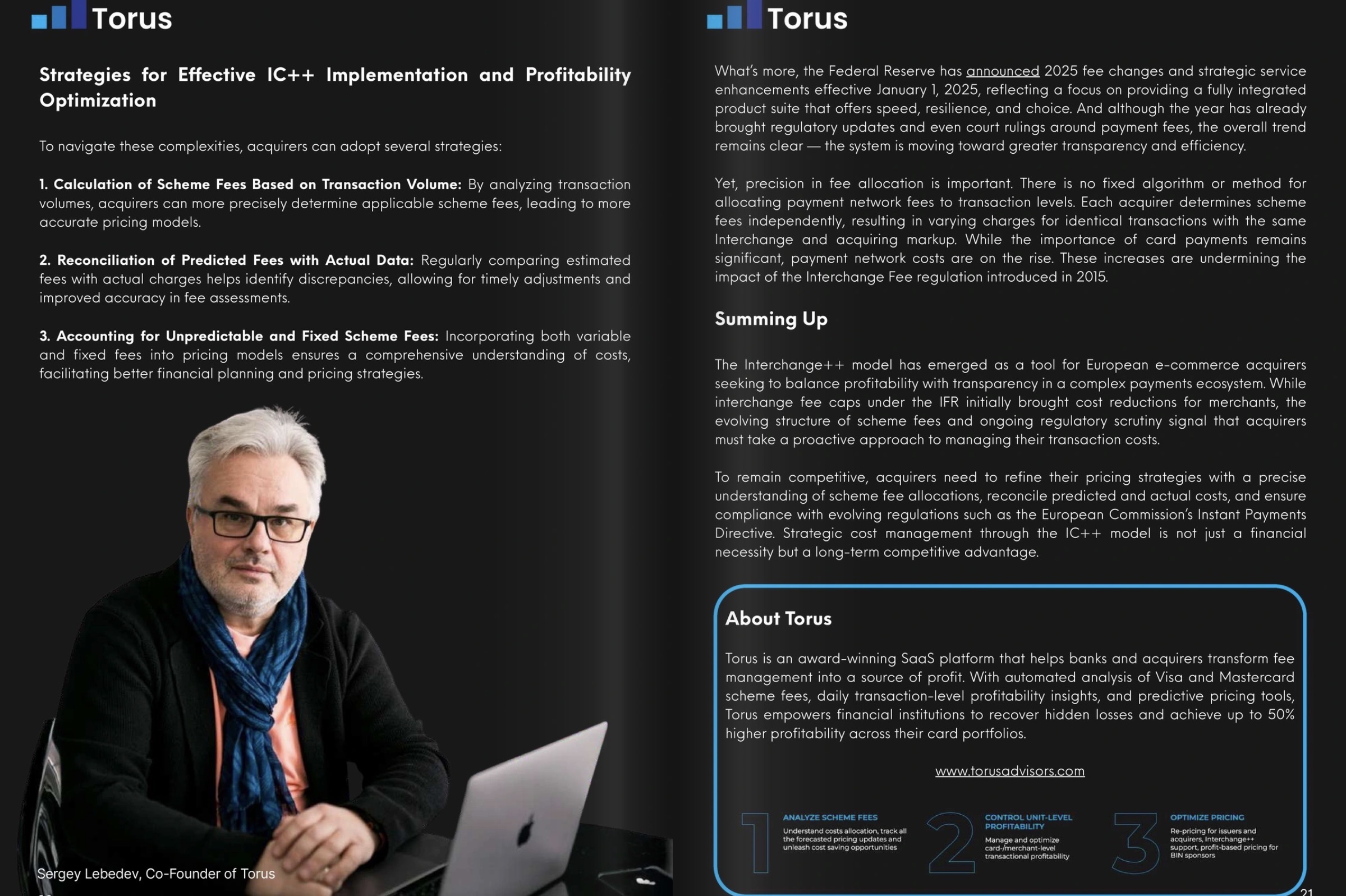Torus is an award-winning SaaS platform that helps banks and acquirers transform fee management into a source of profit. With automated analysis of Visa and Mastercard scheme fees, daily transaction-level profitability insights, and predictive pricing tools, Torus empowers financial institutions to recover hidden losses and achieve up to 50% higher profitability across their card portfolios.